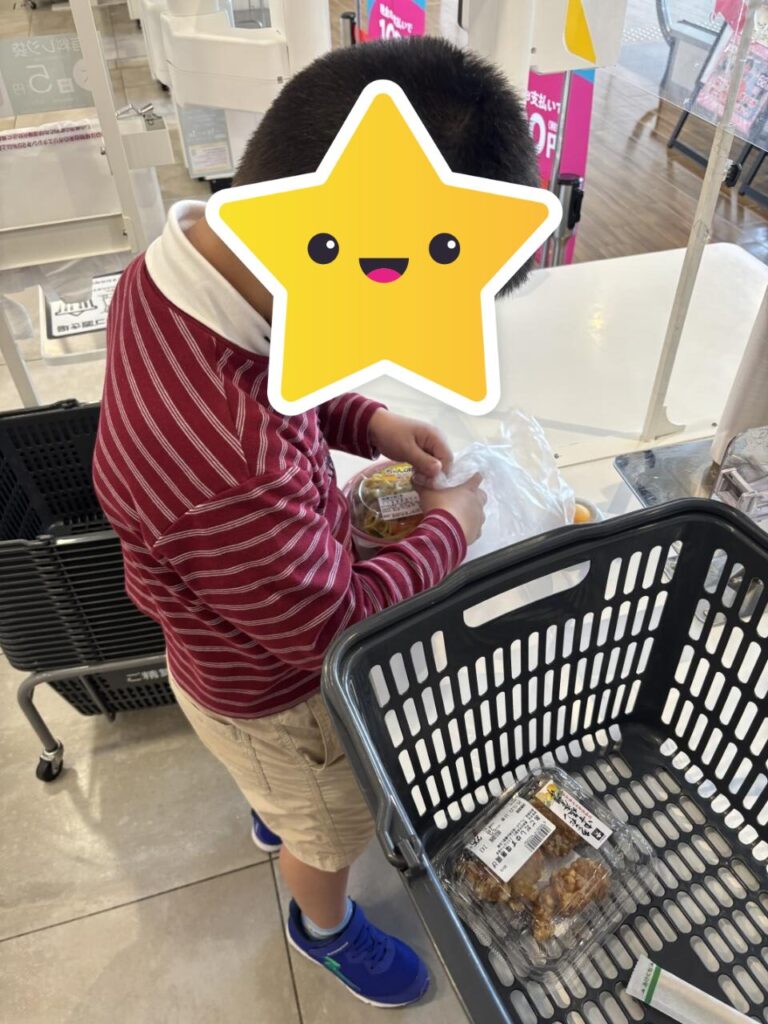 買い物学習でスーパーに行き、レジを通して、自身で袋詰めしています。