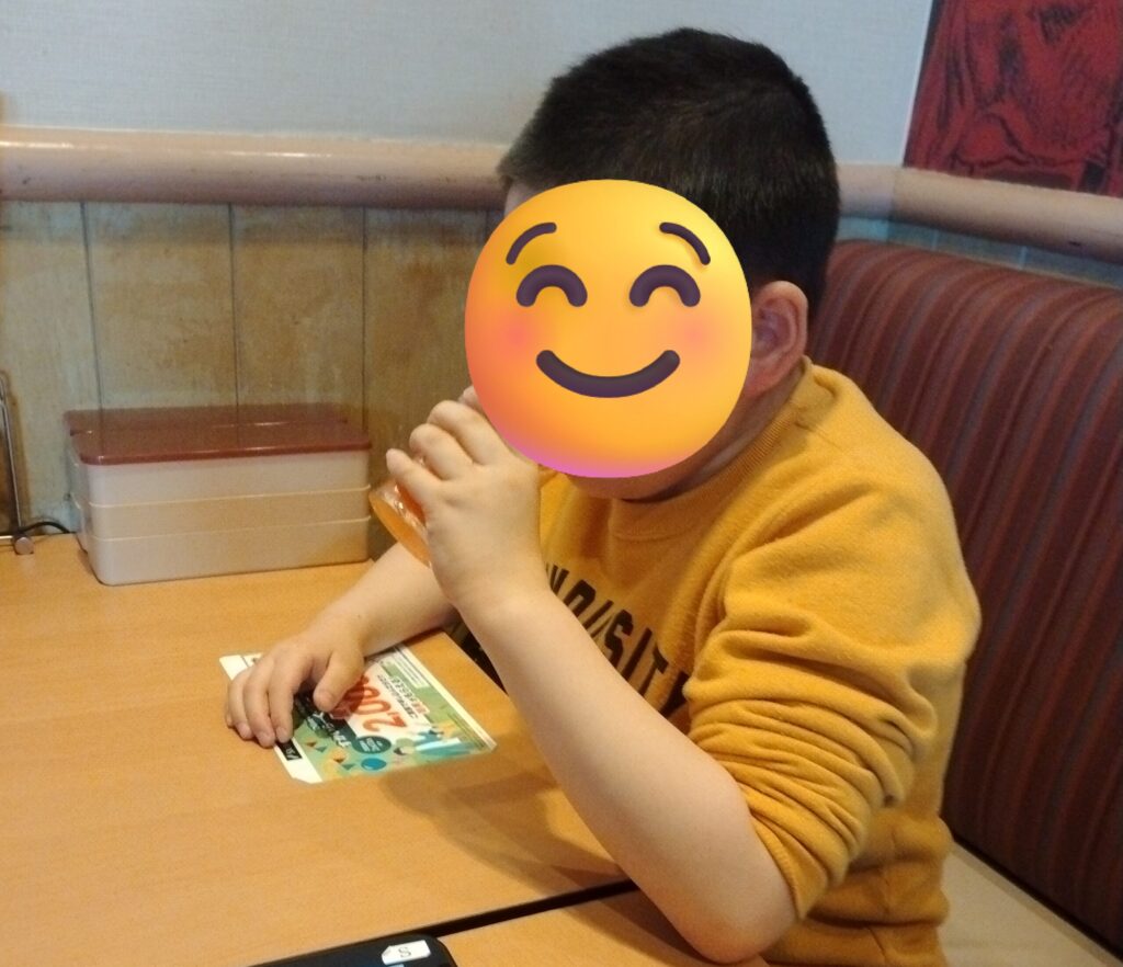家でお母さんと食べるものを相談してくるのかと思いきや、それぞれにメニューをみて自分が食べたいものをお店で決めていました。出来立てのご飯をお友達と食べられるのは嬉しいですね。猫のロボットが運んで来てくれてみんなで「いただきます!!」