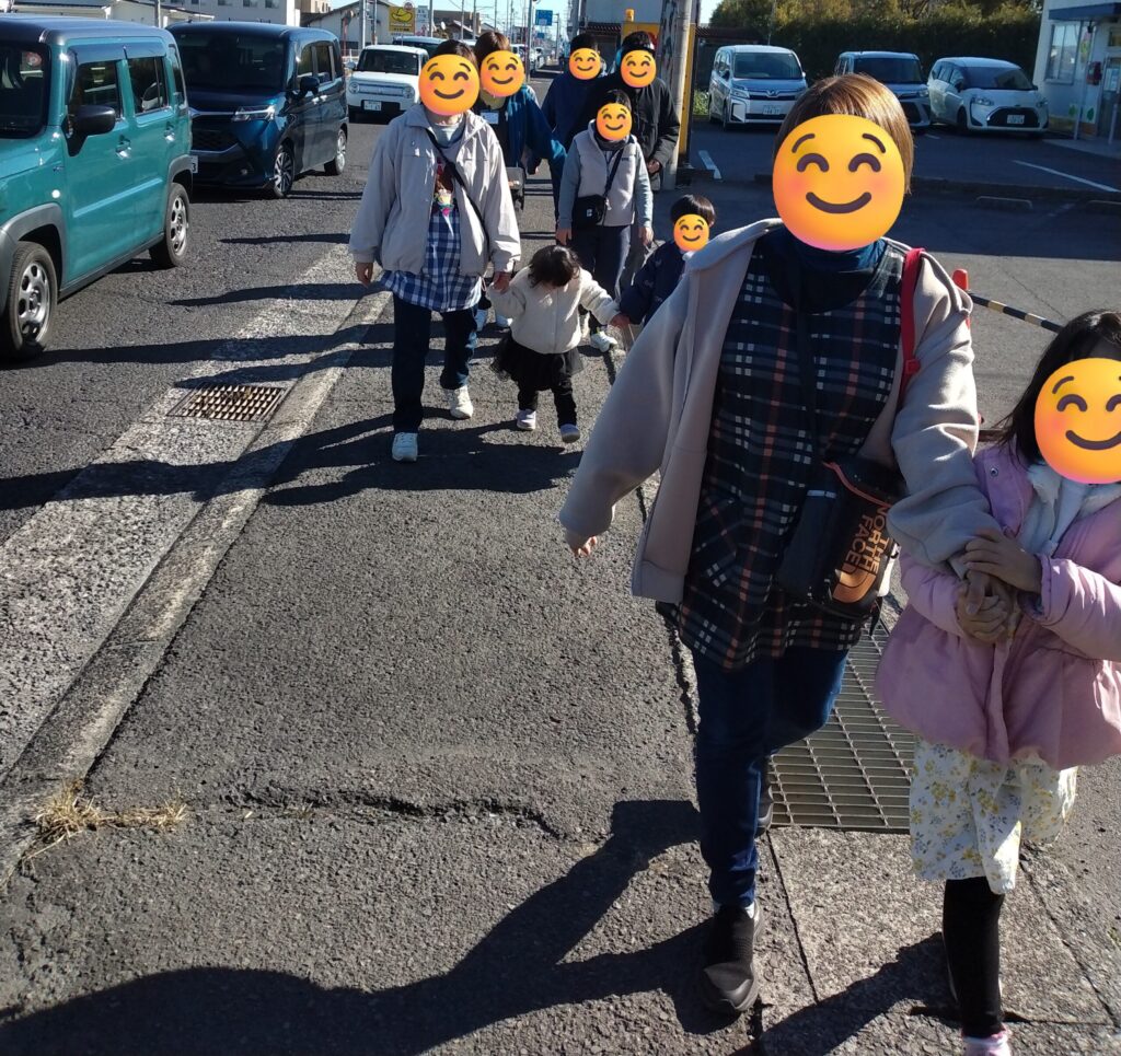 穏やかなお天気の日、みんなで昼食を食べにガストへ行きました。途中信号もありますが交通ルールを守って、手をつないで出発!小さいお友達もしっかり手をつないで歩きました。