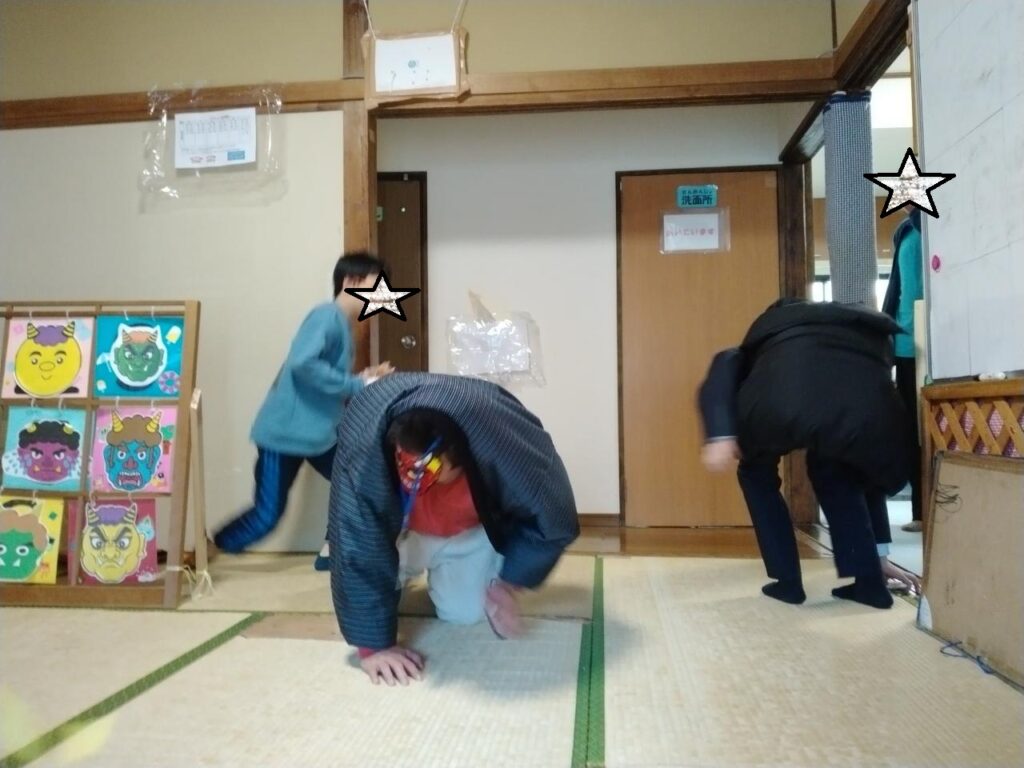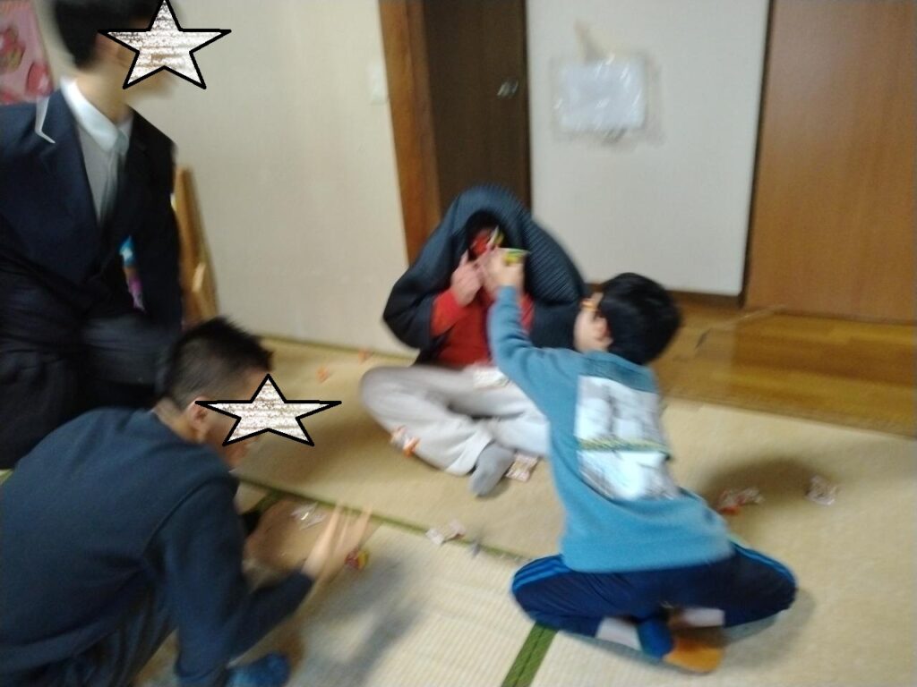 ブログ Blog サイト内の現在地 HOME ブログ (2月3日火曜日/平日)節分豆まきハードモード ひまわり 2026.02.03 (2月3日火曜日/平日)節分豆まきハードモード 本日2月3日は節分の日。なので二日続けての豆まきタイム。 1枚目:鬼に豆を投げることはあっただろうが、基本友好的に、鬼の中の人とは友好的に付き合っているため、当てていいのか躊躇している子ども。 2枚目:鬼の中の人の事は十分理解し、画面がぶれるほどの勢いで、豆で張り倒そうとする子ども3人(ハードタイプ) 3枚目:で、豆を十分に当てられて、逃げる鬼 前へ 一覧へ 次へ